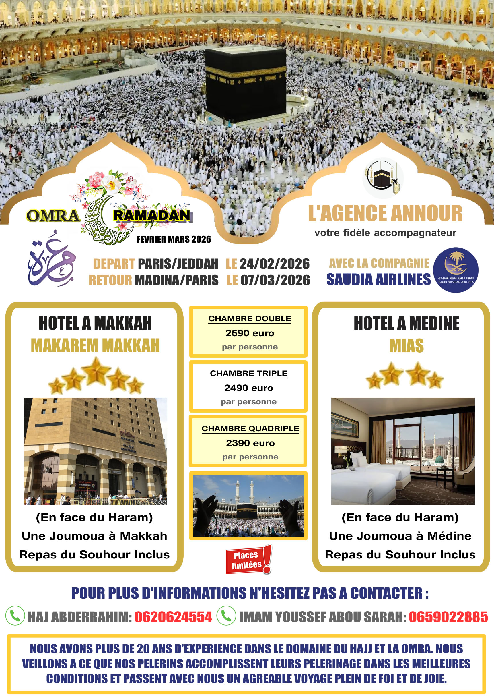 Si vous souhaitez faire une OMRA ou un Hajj incha-ALLAH, remplissez ce formulaire et nous reviendrons vers vous pour vous assister et bien organiser votre voyage aux lieux saints de l'Islam.